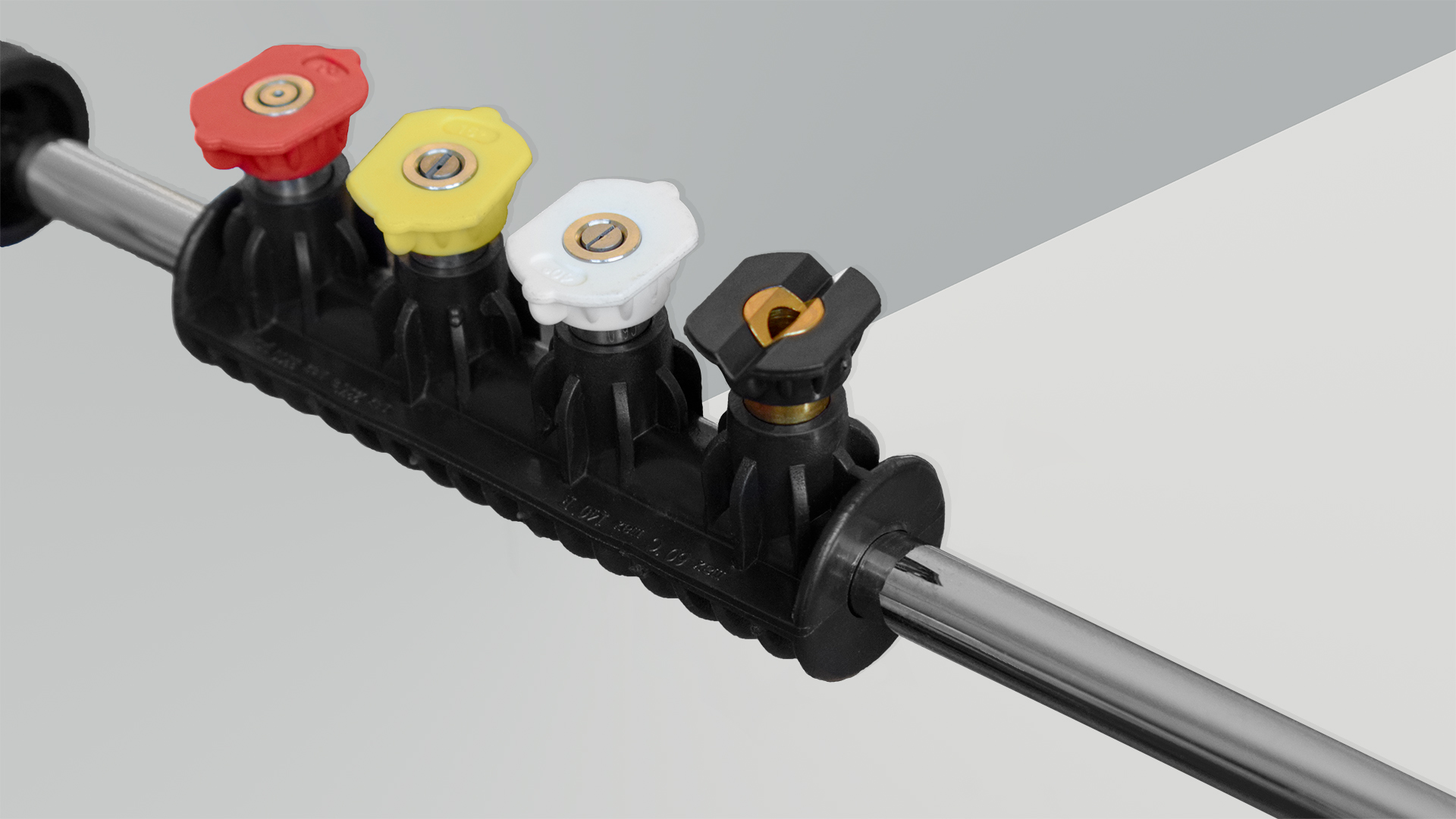 Solidna metalowa lanca z zestawem dysz szybkozłącznych o różnych kątach strumienia.